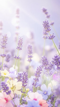 A soft focus close-up of lavender and various other wildflowers in delicate pastel colors, with a gentle sun flare creating a dreamy atmosphere.