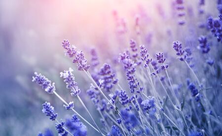 Lavender flower background. Violet lavender field sanset close up. Lavender flowers in pastel colors at blur background. Nature background with lavender in the field.