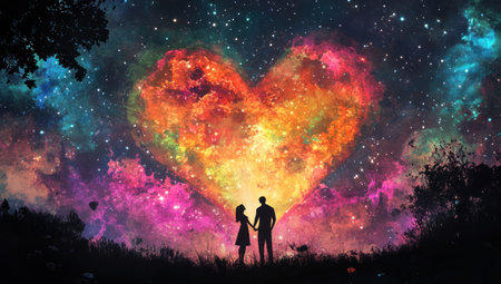 Silhouette of a couple standing in front of a colorful heart-shaped nebula, in the style of digital art, a romantic illustration with a romantic mood, depicting love and romance in a fantasy landscape. The scene features silhouette figures against a starry night sky, with a colorful, bright, and fantastical digital painting. --ar 53:30 --v 6.1 Job ID: 61291f43-8efd-495d-b024-ecb9daf5cae6
