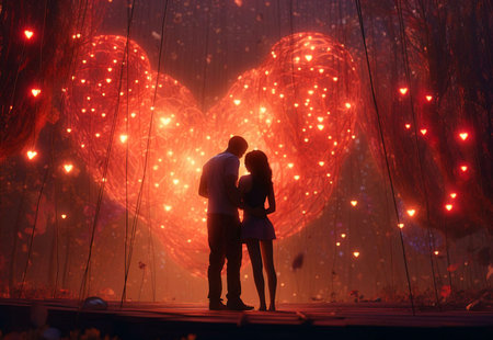 Artistic concept art depicting a silhouette of a couple embracing against a heart-shaped glowing background. The warm light and emotional ambiance create a romantic scene.
