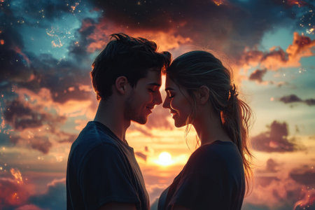 A couple getting ready to kiss each other by sunset background