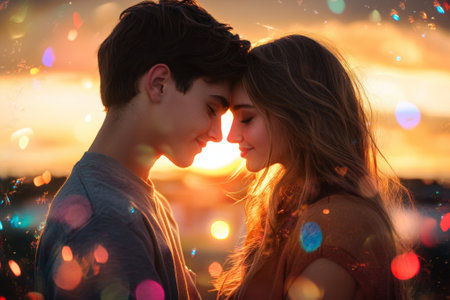 Two people share a tender moment at sunset, surrounded by a glowing, dreamy ambiance with sparkling lights.