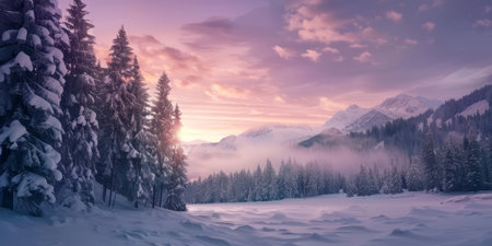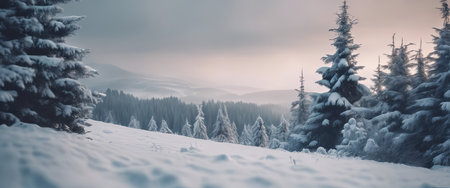 Experience a tranquil winter landscape with lush pine trees blanketed in soft snow, enveloped by fog and majestic mountains, capturing nature's serene beauty.