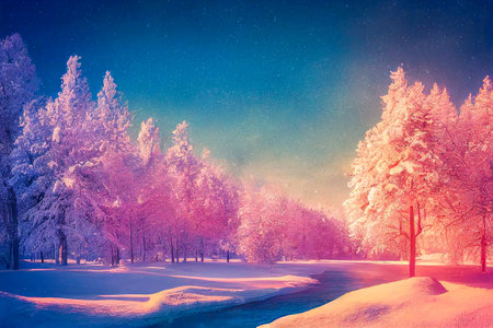 Fantastic winter landscape, colorful sky glowing by sunlight
