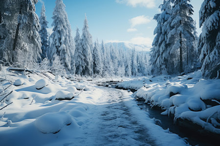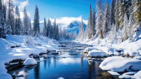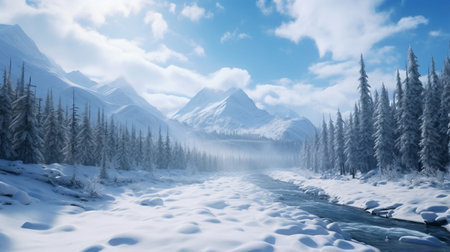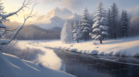 An AI generated illustration of a scenic winter landscape featuring a winding mountain stream and snow-capped mountains in the background