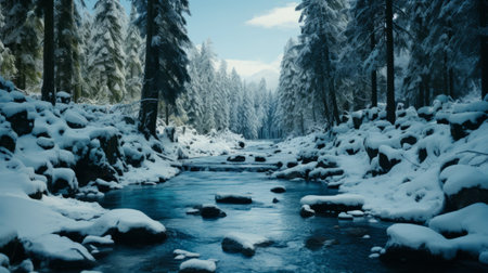 Freezing river in a snowy winter forest, snow and ice in nature, beautiful winter landscape, AI Generated illustration