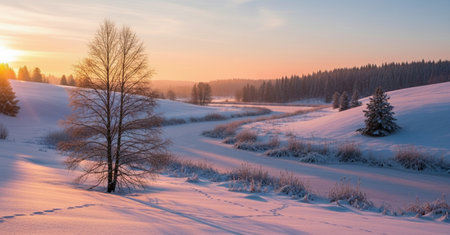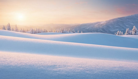 A winter panorama unfolds with gentle, snow-draped hills curving towards a distant mountain range. The rising sun casts a warm, golden and pink glow across the sky, softly illuminating the pristine white snow. Delicate evergreen trees dot the landscape, their branches laden with fresh snow, adding a touch of texture to the serene and tranquil scene. The overall mood is one of profound peace and natural beauty.