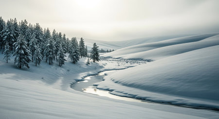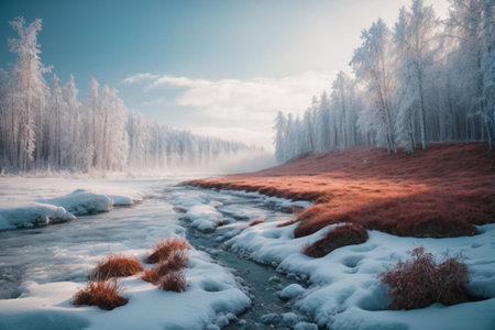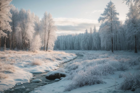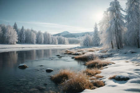Discover a tranquil winter river scene, featuring snow-covered banks, frosty trees, and gentle light creating a serene atmosphere in a stunning natural environment.