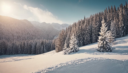 A bright winter sun illuminates a snow-covered mountain slope, dotted with dense fir trees, under a clear blue sky with soft clouds.
