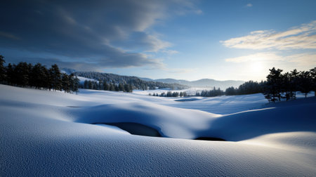 A serene winter landscape features undulating hills blanketed in fresh snow, with distant mountains visible under a calm, blue sky at dawn.