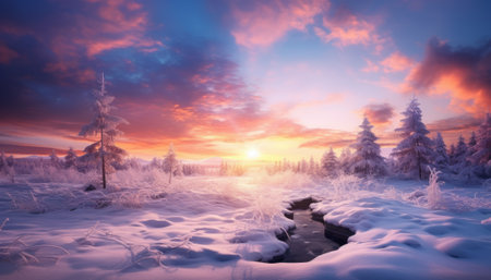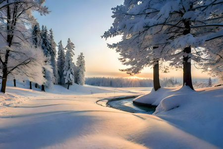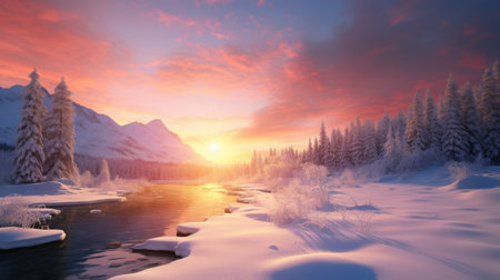 A breathtaking winter sunrise paints the snow-covered landscape with golden light. Frozen trees stand tall, reflecting serenity.