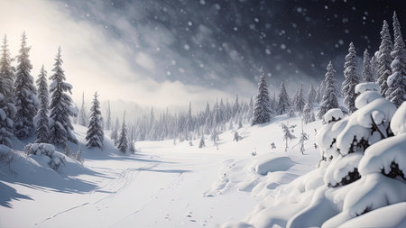 Cute Christmas landscape covered with fresh white snow. Wonderful winter forest. New Year Christmas atmosphere. Festive and enchanting winter wonderland. Snowflakes, snowdrifts and hills. AI generate