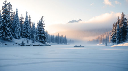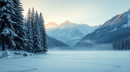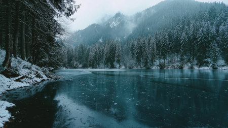Serene winter scene with snow-covered trees and a frozen lake in the mountains