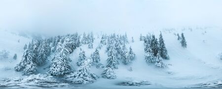 Fabulous snow-covered panorama of spruce trees growing on the mountain slopes in winter in cloudy foggy weather. Winter sports and ski resort concept