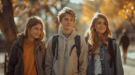 Three Friends Enjoying a Crisp Autumn Day in a Park Surrounded by Golden Leaves
