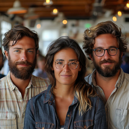 A close up of three cheerful young adults, two men and a woman, posing together with genuine smiles in a modern, warmly-lit living space.