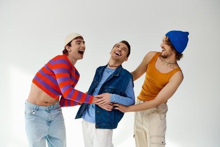 cheerful good looking lgbtq male friends in casual vibrant outfits posing actively on gray backdrop