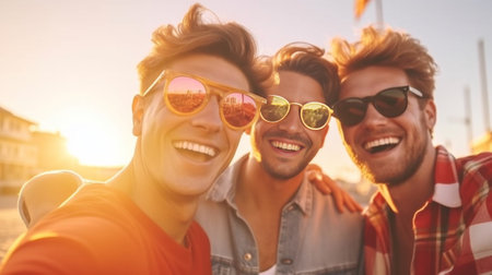 Generative AI : group of guys get a selfie on vacation lifestyle concept