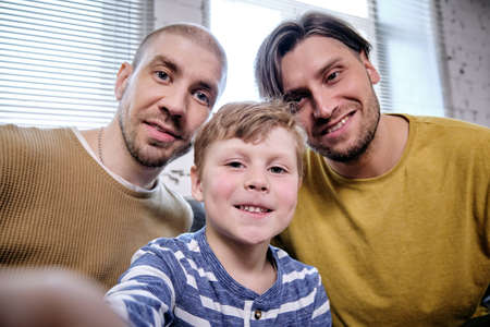 Positive preteen boy taking selfie with his two smiling fathers to post of social media