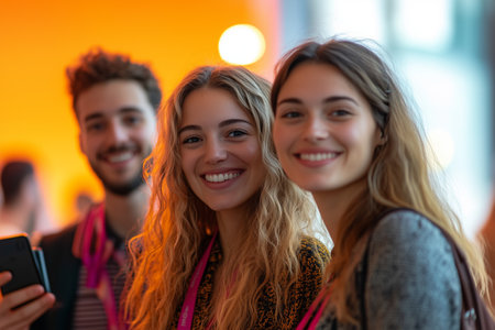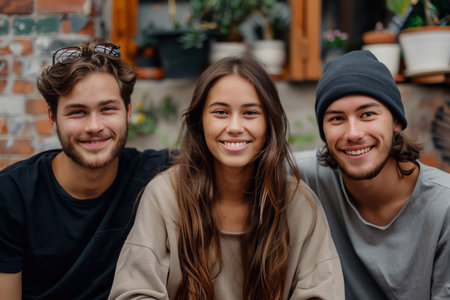 Three friends smiling and looking at the camera, enjoying a fun time outdoors. Bright lights create a cheerful atmosphere in a lively celebration. Concept of friendship, social gatherings, community.