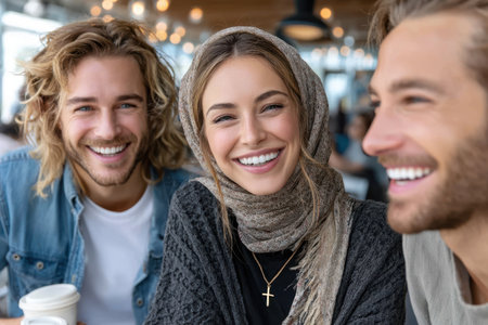 Three friends share smiles and drinks in a bright cafe, creating a joyful atmosphere full of laughter.