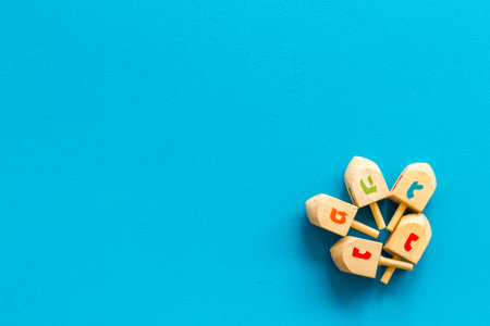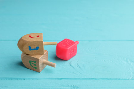 Wooden dreidels on light blue background. Traditional Hanukkah game