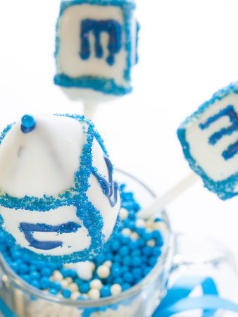 Gourmet dreidels decorated with white icing for Hanukkah.