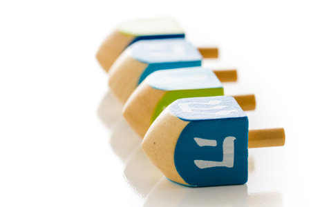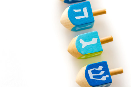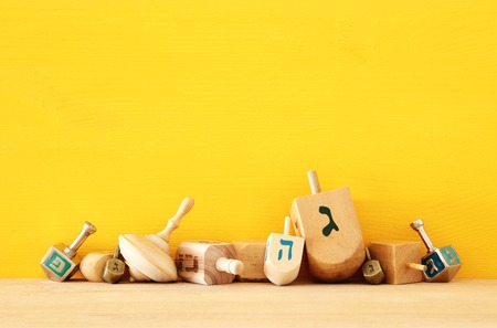 Image of Jewish holiday Hanukkah with wooden dreidels (spinning top)
