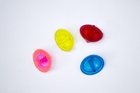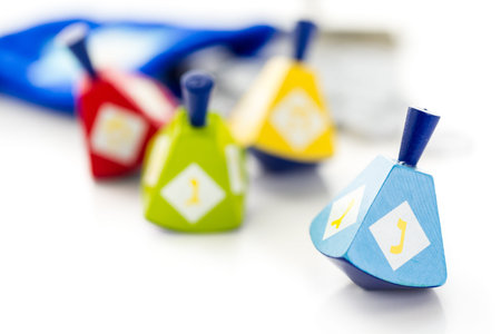 Colorful dreidels on white background.