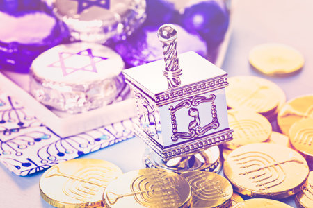 Hanukkah dreidel and gelt on the table.