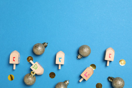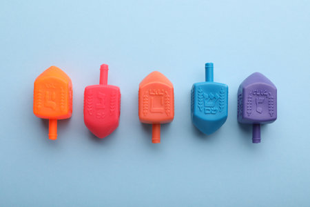 Colorful dreidels on light blue background, flat lay. Traditional Hanukkah game