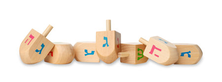 Wooden dreidels for Hanukkah isolated on white or transparent background cutout.