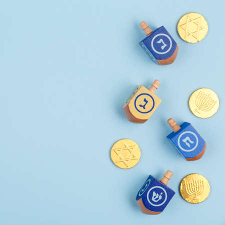 Blue background with multicolor dreidels and chocolate coins. Hanukkah and judaic holiday concept. Square