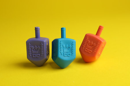 Colorful dreidels on yellow background. Traditional Hanukkah game