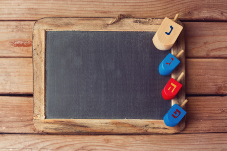 Jewish Holiday Hanukkah background with wooden dreidel spinning top and chalkboard