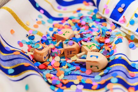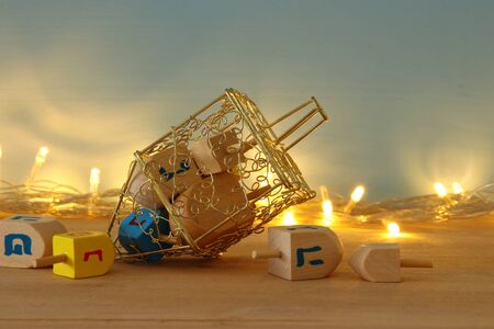 jewish holiday Hanukkah with wooden dreidel spinning top on the glitter background