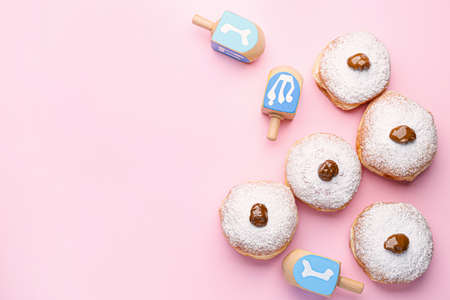 Donuts and dreidels for Hanukkah on color background