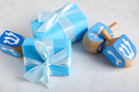 Gifts and dreidels for Hanukkah celebration on light background
