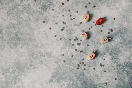 Hanukkah styled stock composition. Decorative pattern. Wooden dreidel toys, golden and silver confetti stars decoration on grunge concrete background. Flat lay, top view. Jewish holiday design.
