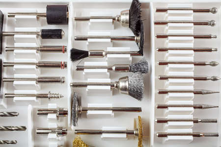 box with accessories for processing and engraving next to an electric tool. hobby and creativity.