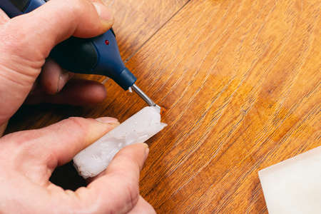 moment of a dental technician working with polishing a crown in his hands