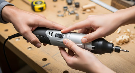 A close-up view of hands holding and adjusting the settings on a grey electric rotary tool in a workshop setting. The background features a wooden workbench with shavings and other tools, highlighting DIY craftsmanship and precision work.