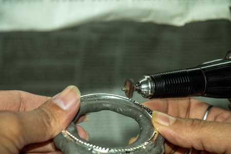 A rough, dark round core is held in hand as a rotary tool refines its surface, while an intricately patterned silver or white metal band is partly fixed to it