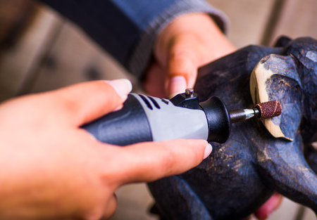 A closeup of a hardworker woman using a polisher over a wood elephant on a wooden background
