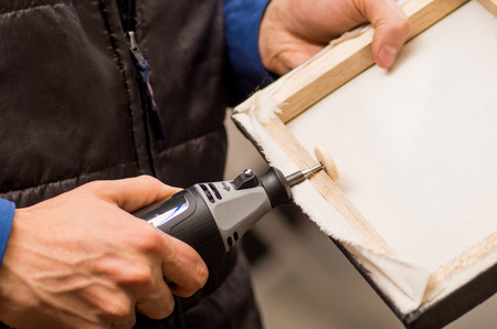 Closeup of a hardworker man holding with one hand a frame and using a polisher in a wooden frame with his other hand