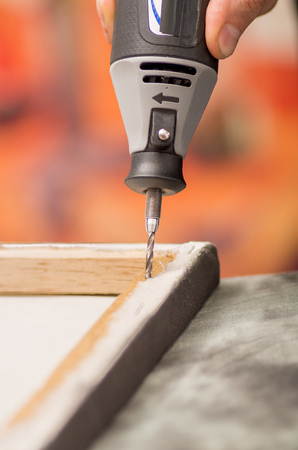 Closeup of a hardworker man drilling a wooden frame with his drill over a gray table in a blurred background