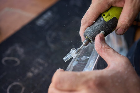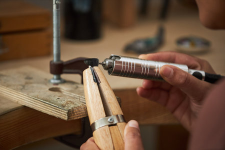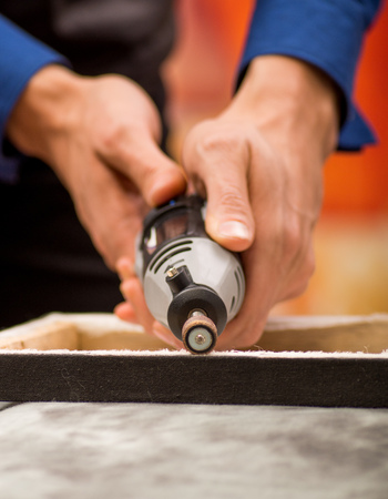Close up image of a craftsman working with a drill in his workshop