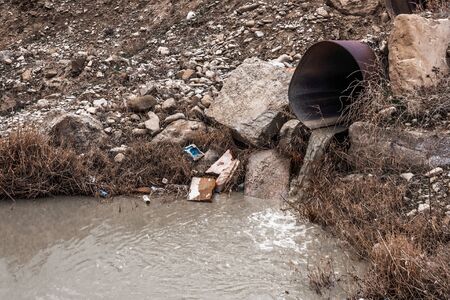 Waste water, mud flows from the pipe into the river, environmental pollution, the environment is contaminated.