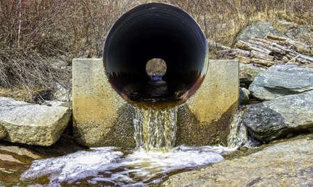 Polluted Drain Pipe with Contaminated Water Flowing into Nature. High quality photo