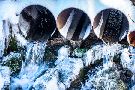 Visual composition of sewage pollution contaminated water flowing from a pipe with impurities